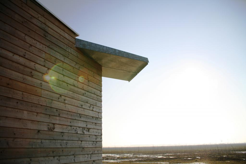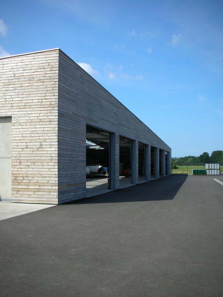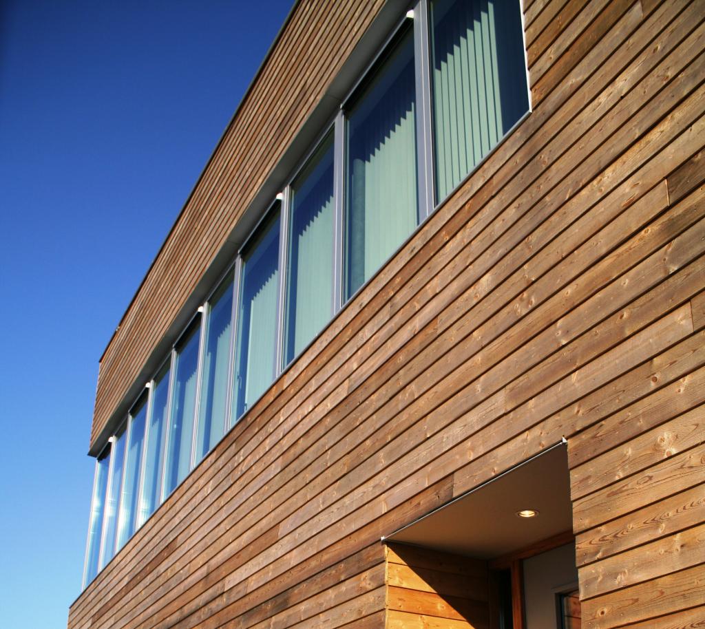 De twee gebouwen, met een gezamenlijk vloeroppervlak van 2000 m2, zijn geheel bekleed met gemodificeerd hout, natuurlijk vergrijzend en duurzaam.