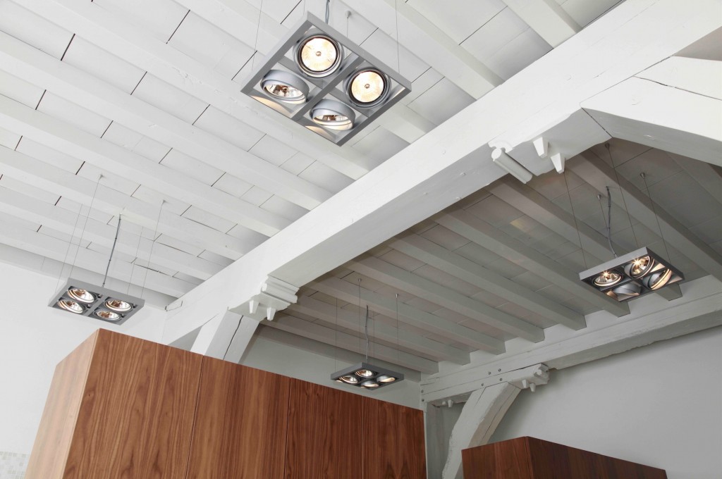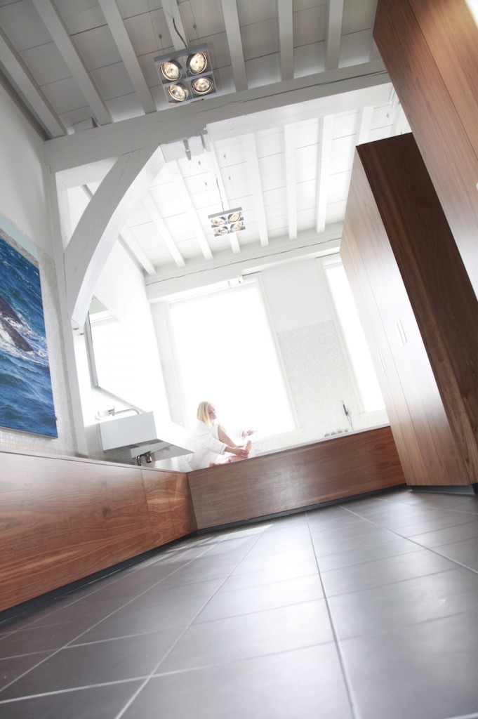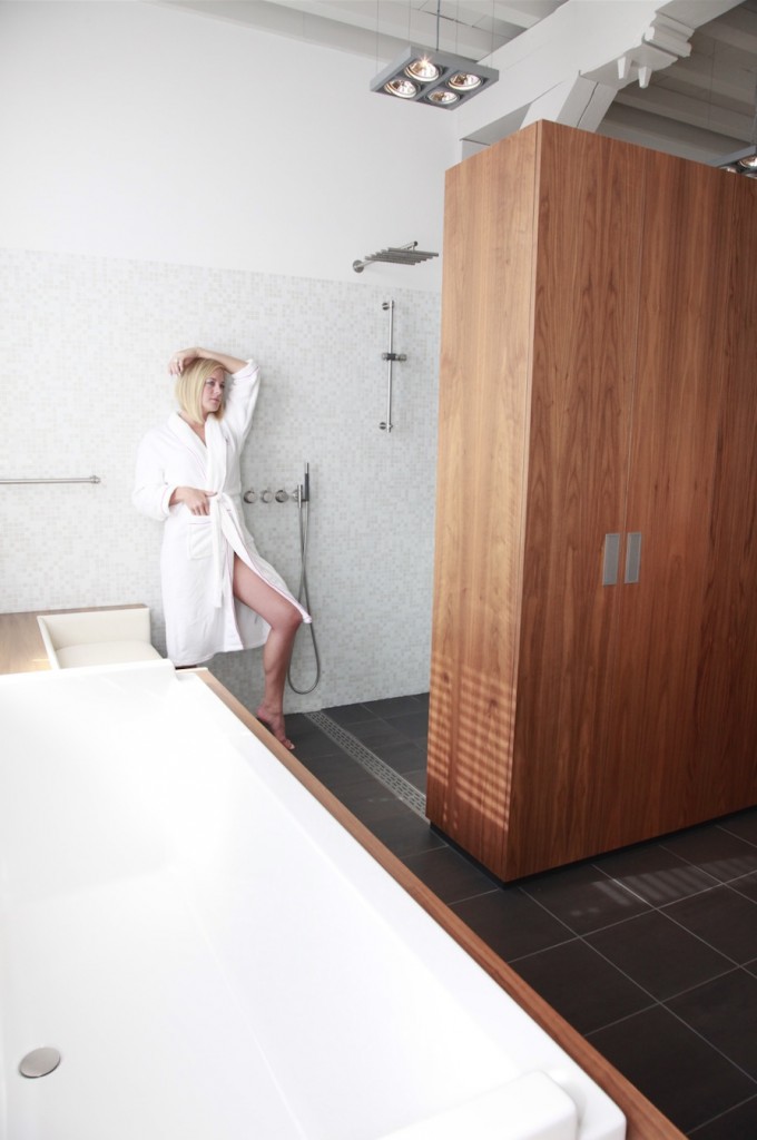 Een houten kastenwand zorgt voor de nodige afscheiding van functies. Aan de voorzijde van de kast bevinden zich in ruime opstelling een dubbele wastafel, een ligbad en een klein zitje, allen met elkaar verbonden door een L-vormige band. Achter de kastenwand bevinden zich de functies die enige privacy behoeven (toilet en douche) of apparaten die je liever niet in het zicht wil hebben (witgoed). Hierdoor blijft de ruimte uiterst overzichtelijk.