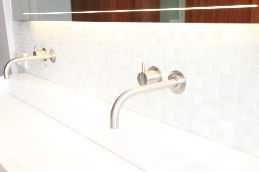 Een ruime badkamer waarin verschillende functies naast elkaar in een ruimte passen. De wens was een grote lichte ruimte waar verschillende functies van de ruimte niet opvallen en uit het zicht zijn.