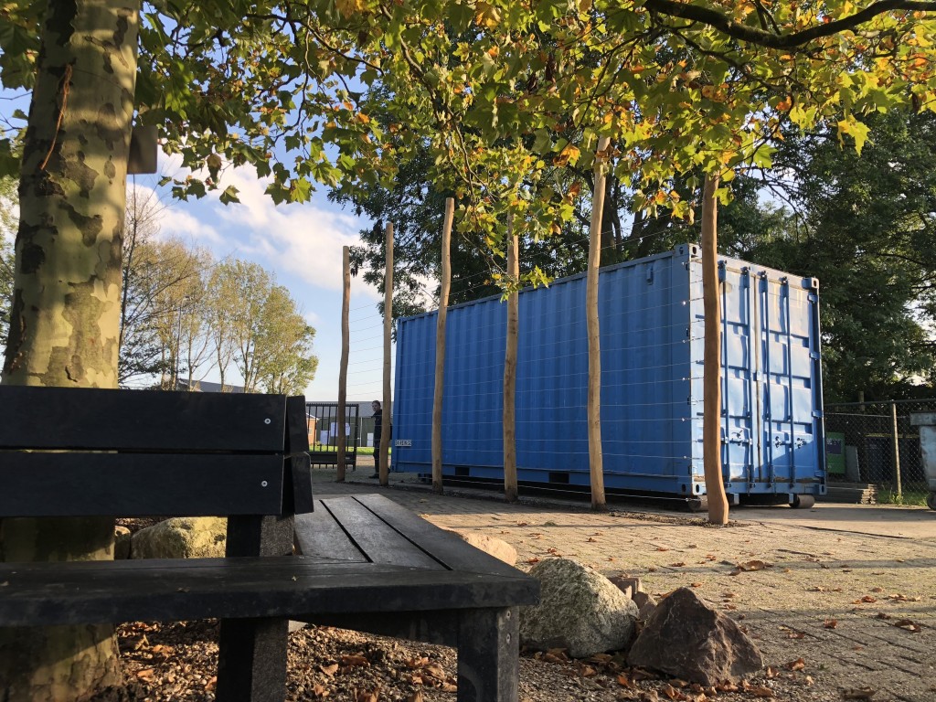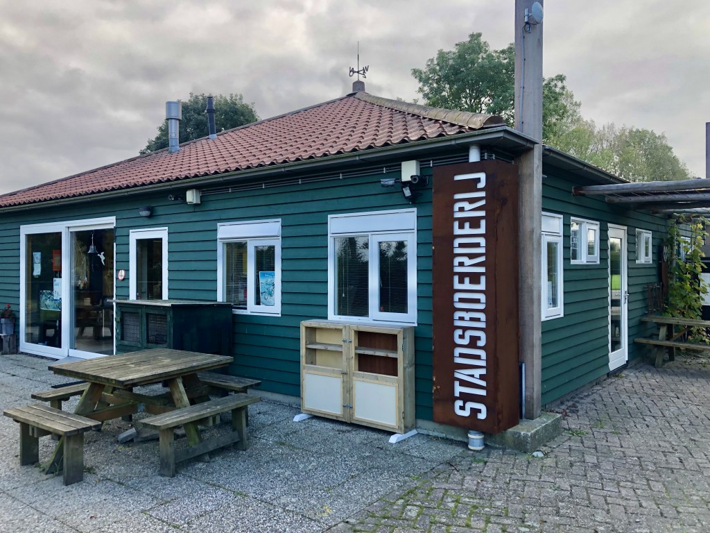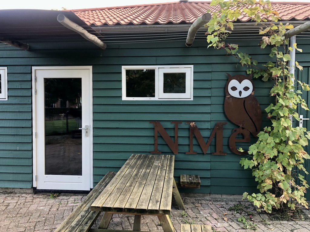 Ontwerp voor een workshop/opslag-ruimte voor het NME in de Stadsboerderij met eigen ingang. Een te begroeien pergola is toegepast om de entree extra te benadrukken. Daarnaaast is signing aangebracht in Cortenstaal voor zowel de NME als de stadsboerderij. De papiercontainter wordt afgeschermd door een te begroeien hekwerk, opgebouwd uit Robinia-palen met gespannen draden. Dit sluit aan bij de luifel van het NME.