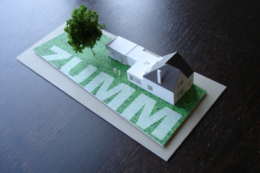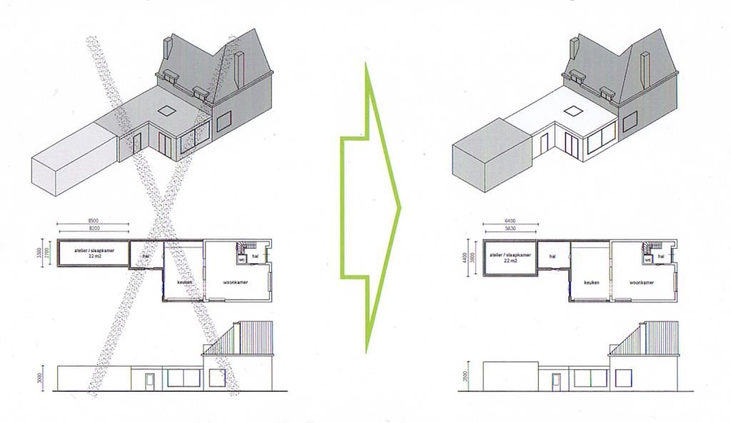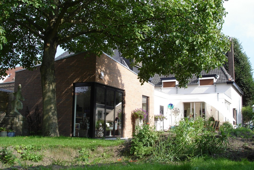 De wens was om aan dit in de jaren 70 al eens uitgebreide woonhuis nogmaals een aanbouw te maken. Het nieuw te bouwen volume werd geen aanbouw aan een aanbouw maar vormt nu met de reeds bestaande bebouwing een nieuwe compositie waarbij het deel uit 1973 fungeert als koppelstuk tussen oud en nieuw.