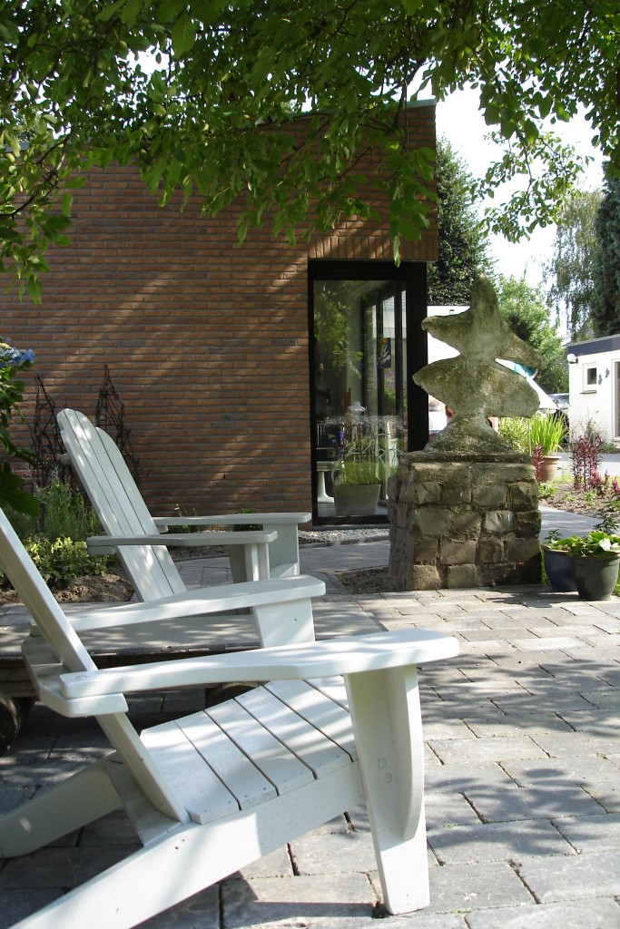 De nieuwe aanbouw is geen voortborduursel op de bestaande aanbouw maar heeft zijn eigen vorm, kleur en afwerking.