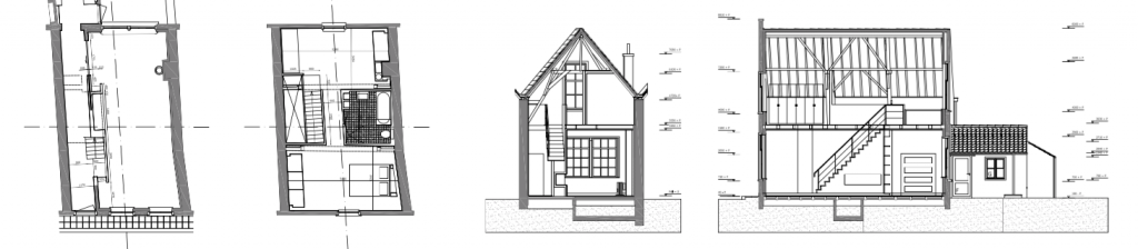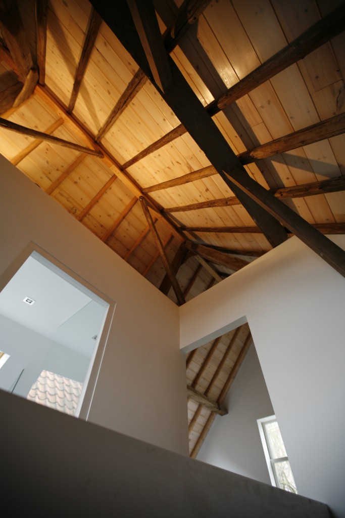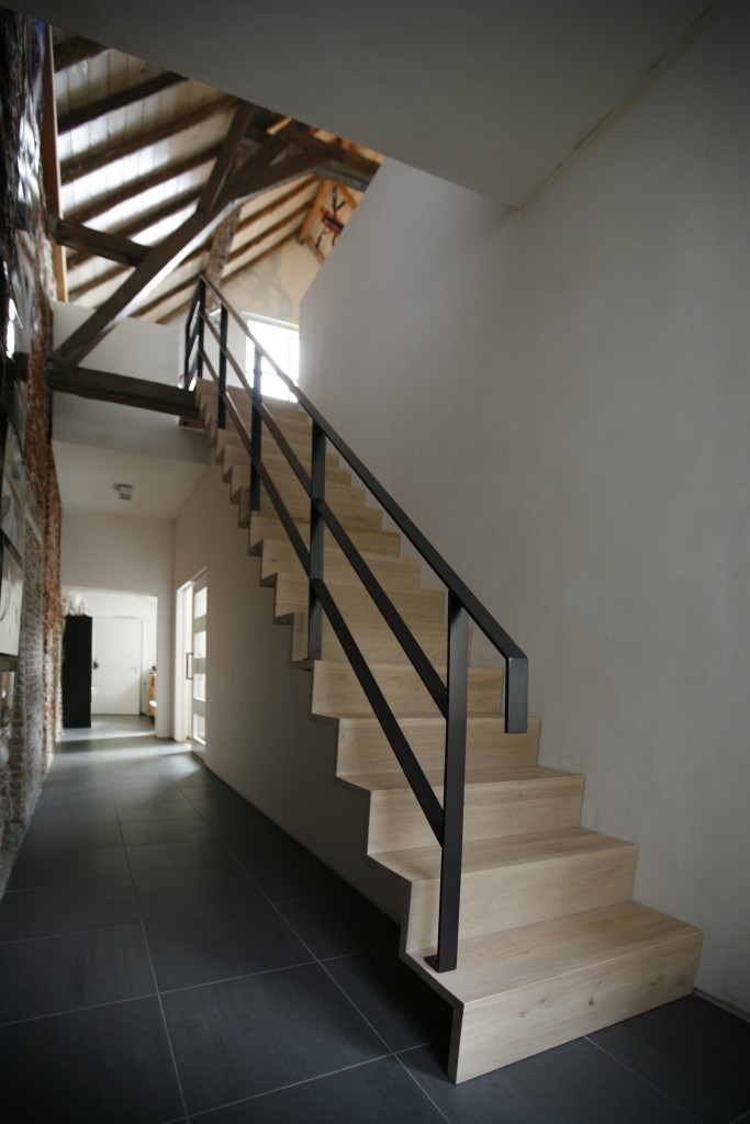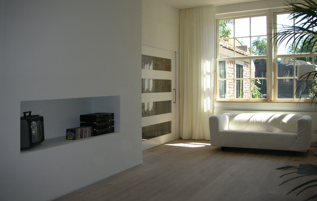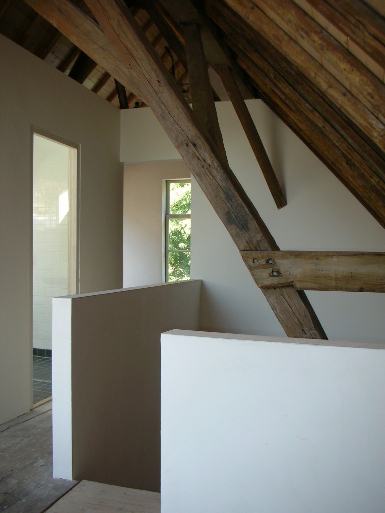 Met respect voor de authentieke elementen is een eigentijds interieur gecreëerd waarbij de nadruk ligt op ruimtelijkheid en contrast. De authentieke constructies zijn opgenomen in het moderne ruimtelijke interieurontwerp en komen hierdoor goed tot hun recht.